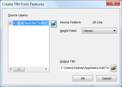 1.Click “Create TIN” and then choose “from Features” in the drop-down menu of 3D Analyst toolbar. 2.Check an existing vector data on the list of “Source Layers” or click 3.Then, choose an attribute field (value) from “Height Field” to save elevation data. 4.Specify the path and file to save the output TIN data on the box named “Output Tin”, or click 5.Click “OK” to create TIN from features.