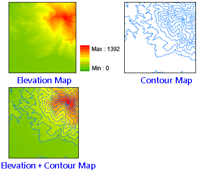 With the contours, the areas with the identical values can be identified. If it is used in terrain, you can simulate the slope by visualize the contours. See the figure of the left, the terrain type can be identified on DTM but not the slope. If with the contours, the steep and flat areas (evaluated by the contour interval), ridge and valley (the convergence of contour) can be clearly identified.