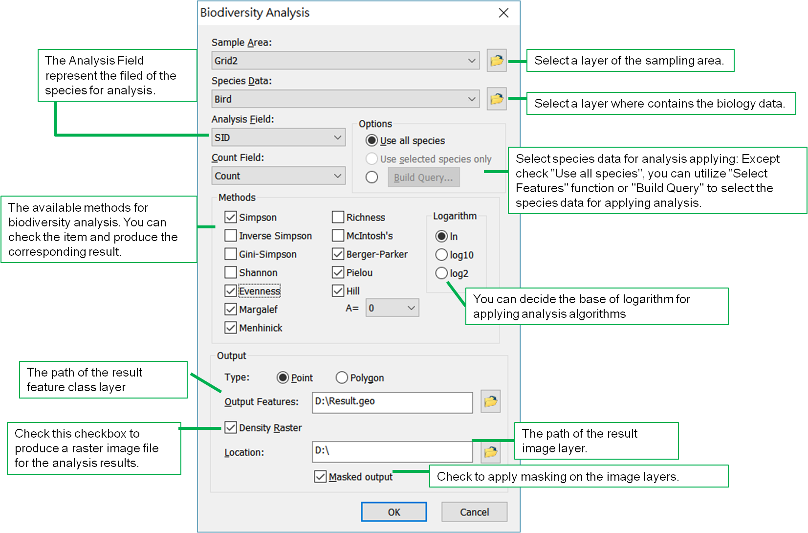 Biodiversity Analyst is an extension of SuperGIS; before you start using this extension, you should start SuperGIS first. And in the Biodiversity Analyst window, you can easily indicate the Analysis Field of Species data; choose the logarithm for analysis. You can set to output result and decide whether mask the result under the sample layer(analysis range).