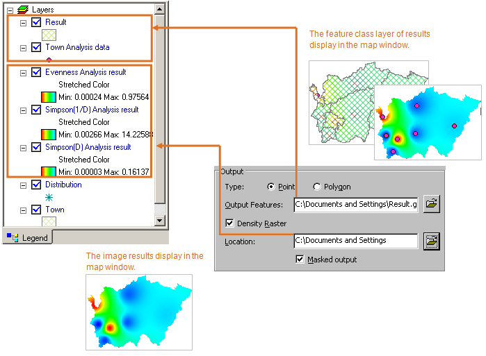 The result will be represented in feature class layers in point or polygon format as well as raster layers. The feature class layers in point or polygon format record the result data, and each raster layer represents the density chart for one analysis result. And you can change the color of renderer in raster layers to enhance the readability of result chart.