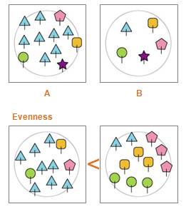 Evenness is a measure of the relative abundance of the different species in the same area. We can see the sample explained in Richness indices: Graph A and graph B have the same richness index, but as evenness is concerned, graph B would have higher equitability than graph A.