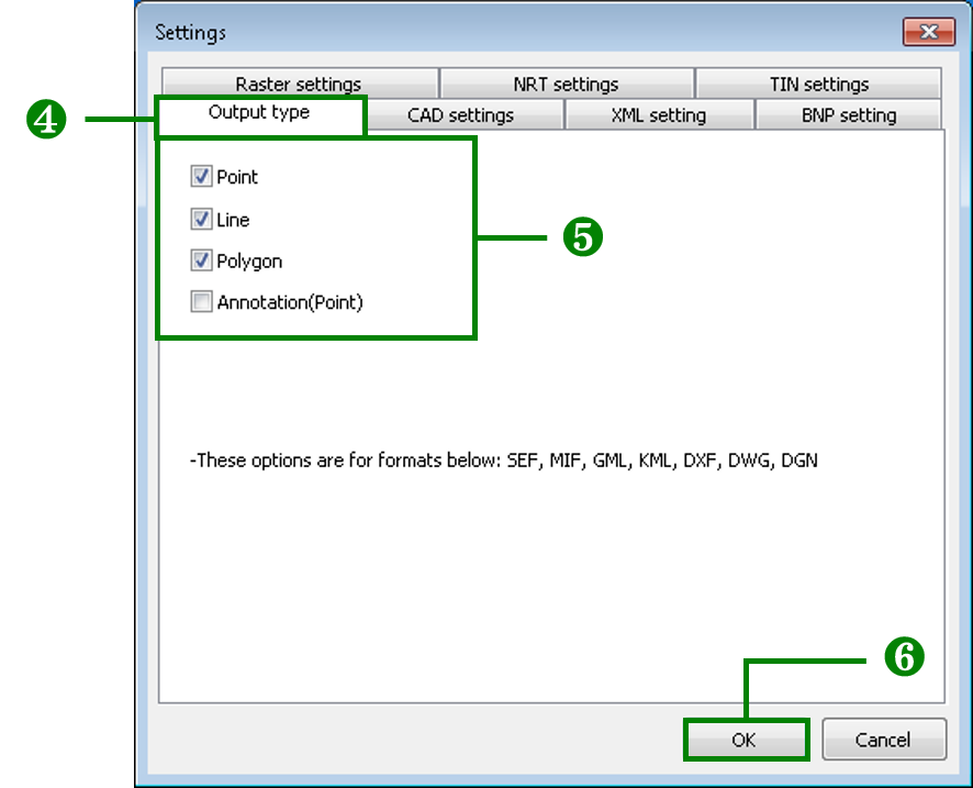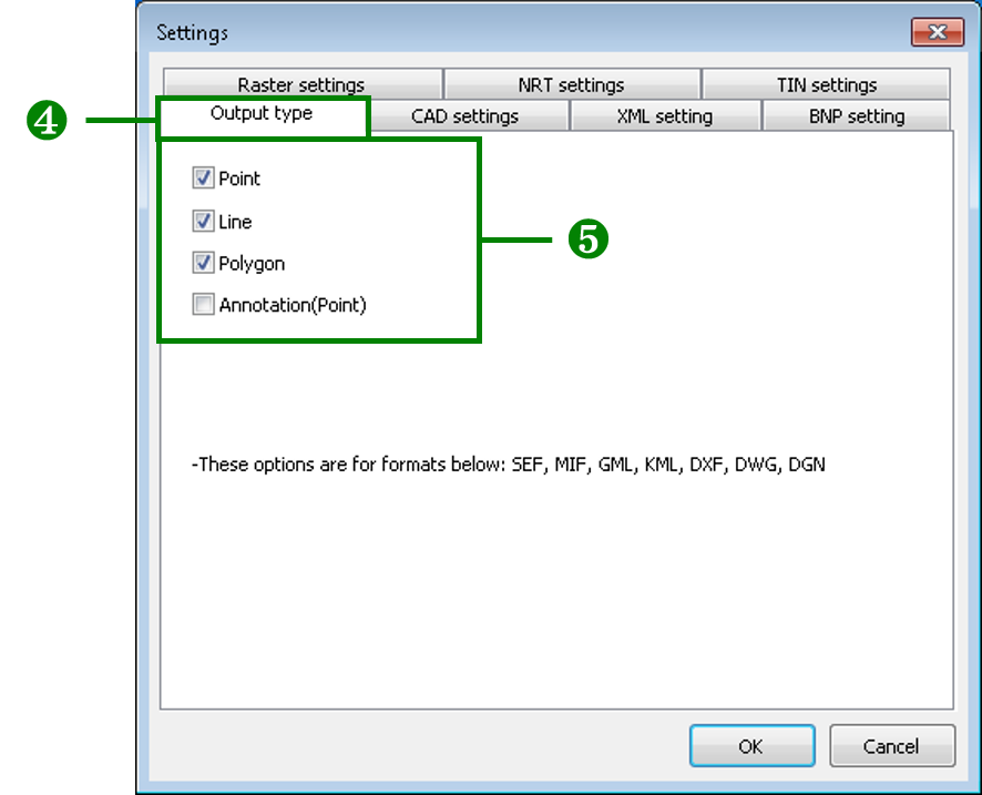 5. The options in Output type include Point, Line, Polygon, and Annotation. You can tick the option(s) to decide the geometry type of the output features.