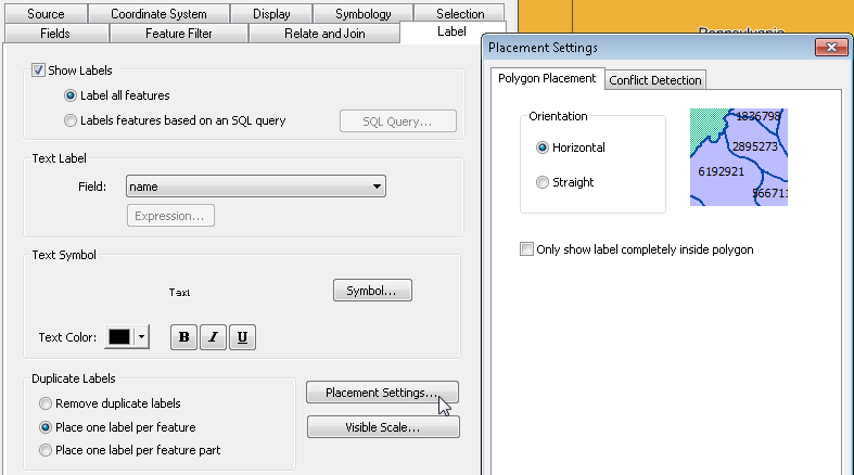 To label polygon features, you can choose "Horizontal" or "Straight." Meanwhile, you can choose whether to use “Only show label completely inside polygon.”