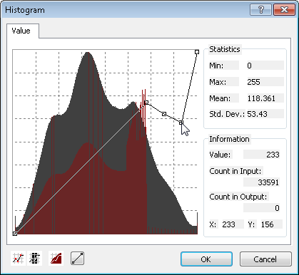 on "Histogram" window to add breakpoints to adjust the distribution of colors of the image. The grey part in the histogram is the value distribution of the input image, while the output image is displayed in other colors (like dark red, green, blue). In the following graph, due to the histogram of single-band image, the distribution of the output image is displayed as dark red. Meanwhile, you can move the mouse cursor around the histogram to check the count of the cells in the input image and the count of the value which is changed by the settings of the output image. In the lower-left graph, the current cursor position shows that the color 190 in input image posses 0 cell but possess 831 cells in output image. If you would like to know the new value generated by adjusting the line, you can move the mouse cursor to the X coordinate of the value in the input image and move the cursor to the line, the Y coordinate in lower-right corner of the window indicates the new value generated by adjusting the line. Take the lower-right graph for example. The original color is 158, but the new value generated by adjusting the line becomes 236. If you want to reset the image, you can click