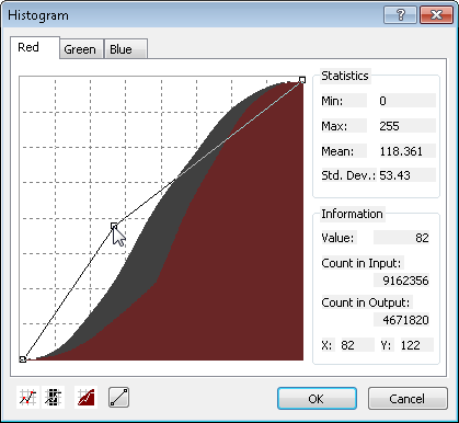 The lower-left graph is a histogram of multi-band image; the lower-right graph is the histogram of single-band image. For multi-band images, the histogram window contains 3 tabs to present each band, while the histogram of single-band image displays the distribution of the color of the image. "Statistics" field on the right side records the data of the cells of the band, such as min, max, average, standard deviation. Meanwhile, you can move the mouse cursor around the histogram to check the value and the count of the value in "Input" and "Output" in "Information" field. The X axis refers to the color of the input image, so the range is from 0 to 255. The Y axis is the color of the output image, so the range is also from 0 to 255.