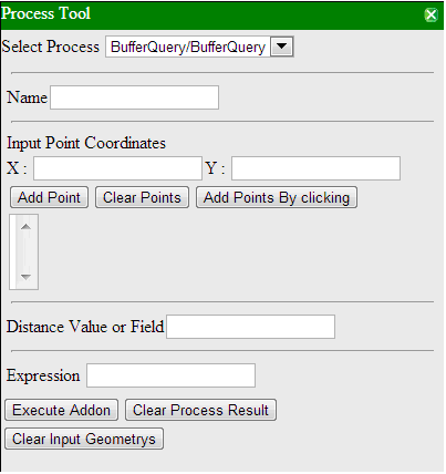 After publishing the project to the SuperGIS Server and activating Geo-processing service, you can use the service through building an Ultra website. Link to the Ultra website and click on Process Tool icon. Then, you can open the manipulation window as shown in the picture below. Parameter fields from top to bottom displayed in the following picture correspond to parameters that you designed in SuperGIS Desktop from one to four in order. Please enter parameters you require in each filed and then click “Execute Addon” to perform the analysis. Formats for each parameter are listed below.