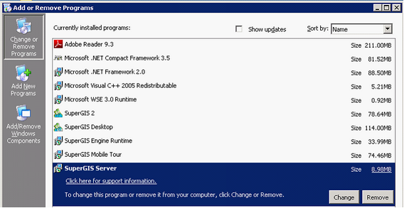 1. Firstly, go to Control Panel / Add or Remove Programs and find out SuperGIS Server.