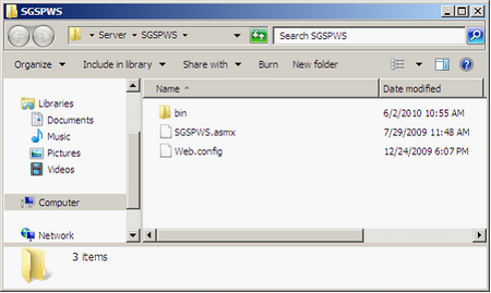 5). Right-click SGSPWS virtual directory, choose Explore, and check whether SGSPWS.asmx, Web.config, and bin subdirectory are contained in SGSPWS.
