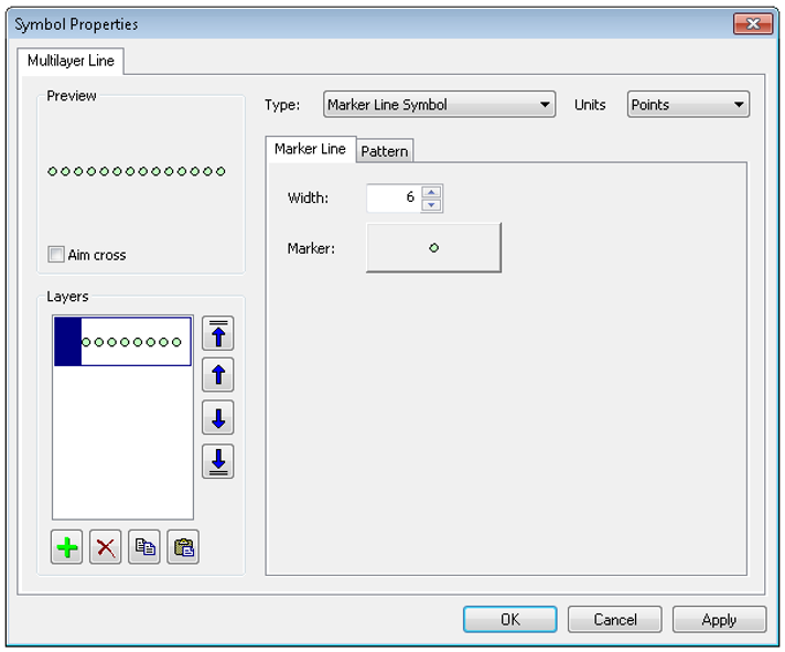 Each line symbol can be arrayed by point symbols in “Marker Line Symbol.” Users need to set up styles of point symbols first. Second, click “Marker” to open “Symbol Selector” and then set style of point symbols. Function “Width” controls the size of each point symbol. The bigger each point symbol, the wider the interval among lines.