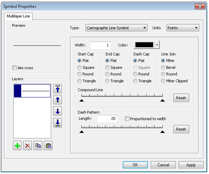 In order to create the line symbols fitting users need by “Dash Pattern” function, users can drag one triangle each time to form a proper length to create the line symbols with proper interval. Entering value in “Dash” cell and checking “Proportioned Width” enable users to adjust styles of line symbols. To undo the style of line symbol, please click “Reset.”