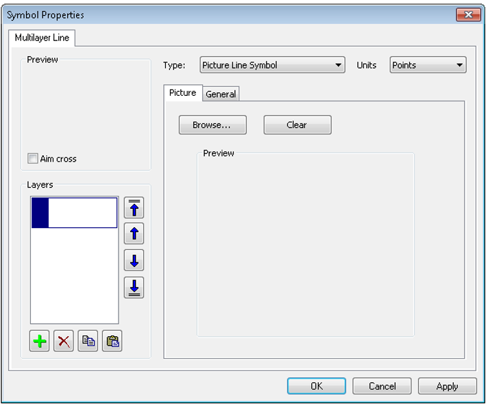 In the Picture tab of Picture Line Symbol type, users can specify and add picture by clicking Browse and preview in Preview. You can click Clear to delete the picture. In General tab, you can change the width of line.