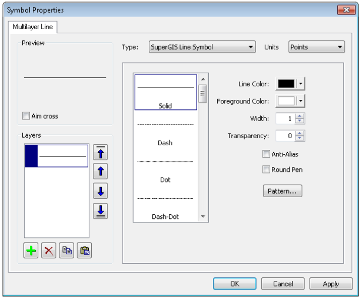 In SuperGIS Line Symbol type, you can select the built-in line symbol style. You can change line color in Color, select fill color in Foreground Color, for example, to a line of Arrow at end style, you can change the fill color of the arrow. You can set width of line in Width, transparency in Transparency. Checking Anti-Alias enables to smooth the jagged edge of line, making the line looks smoother. Checking Rounded Pen makes the double-line style has its start and end closed by connecting two lines at two ends. Image style allows users to increase the specified picture to the line symbol.