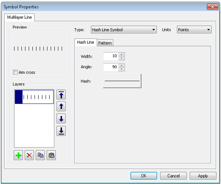 Each line symbol can be arrayed by parallel line symbols in Hash Line Symbol” type. Click “Hash” to open “Symbol Selector” and then set style of the parallel line symbols. Users can also utilize “Width” to set length of parallel line symbol, and “Angle” to adjust degree of parallel line symbols. In “Pattern”, users can modify interval among parallel line symbols by utilizing cursor to drag one triangle each time and entering value in the cell “Length.” “Reset” is used to undo the steps manipulated above.
