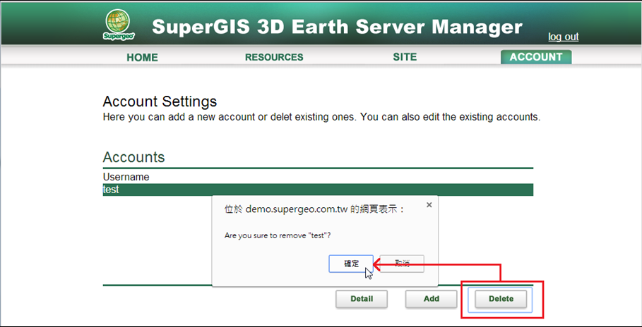 要刪除既有的帳戶,請在「ACCOUNT」的帳戶列表中,點選欲刪除的帳戶,接著點擊「Delete」,您將會看到「Are you sure to remove “xxx”」的訊息,按下「確定」即可完成刪除。