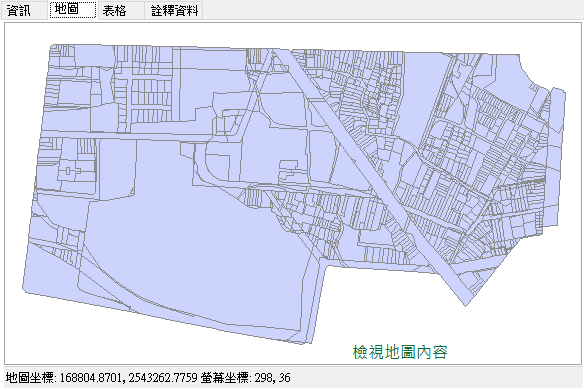 另外,在您檢視這些圖層資料的過程中,亦可以使用「瀏覽工具列」上提供的放大、縮小、平移、放至全圖、及查詢等基本圖層檢視功能來協助您檢視該圖層資料。