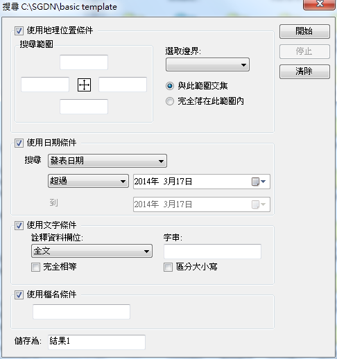 註:若於「搜尋」視窗中,右上方的「開始」按鈕顯示灰色無法點擊時,是因為您於資料導覽或資料展示區域中選取了一般圖層資料而非資料夾所致,請重新選取資料夾後,再執行搜尋功能。每次搜尋的結果皆會以累積的方式儲存在「搜尋結果」節點下的資料夾中,建議您可在每次搜尋開始前,先於「搜尋」視窗的「儲存為」欄位中設定好此次搜尋結果欲存放的資料夾名稱,以利檢視搜尋資料。