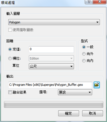 ,瀏覽欲儲存輸出圖層的位置。「融合結果」選項,若勾選此選項,系統會將該圖層中建立所有環域融合為一筆圖徵;若不勾選此功能,則每一筆圖徵則獨自建立環域。另外在「選項」下拉選單中分別「預設」、「品質優先」和「效能優先」這種方式,使用者可依照需求做選擇。