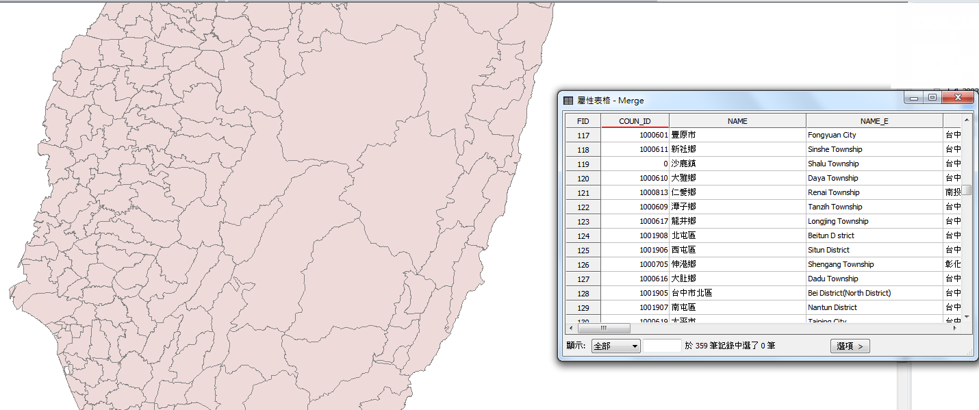 合併後的圖層會顯示於地圖視窗中的最上方,該圖層的屬性表格亦合併了兩原圖層的屬性表格資料,但以輸入圖層的屬性表格為基準。