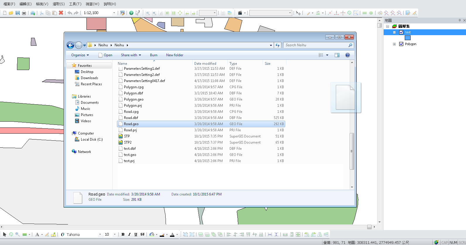 方法四、 您也可以直接開啟圖層資料夾,以滑鼠拖曳方式,直接將檔案拖曳至地圖內容視窗中,地圖視窗即顯示該圖層內容。
