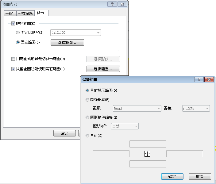 而「固定範圍」的功能,是能夠限制地圖的顯示範圍為固定無法改變,使用者還能根據不同方式畫出所需要的地圖顯示範圍,讓地圖畫面僅能夠出現在使用者所選擇的範圍內。範圍的設定分別有「目前顯示範圍」、「圖徵輪廓」、「圖形物件輪廓」以及「自訂」範圍供使用者選擇。接下來為您分別介紹這四種不同範圍的功能設定。