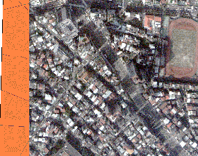 以下圖為例,此份地圖同時套疊多個圖層,包含影像圖層和向量格式圖層;您可調整影像圖層的透明度,使位於下方的圖層可在影像圖層上透出。左圖為影像圖層透明度0 %的地圖畫面,影像圖層的範圍內,完全覆蓋下方圖層的顏色;右圖為透明度30 %的地圖畫面,影像圖層的範圍,可看出隱約透出下方圖層的橘色和藍色。若影像圖層下方無其他圖層,調整透明度則會透出地圖背景顏色。