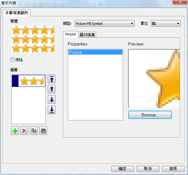 「Picture Fill Symbol」類型中的「圖片」頁籤可以加入使用者所指定的圖片,點選「瀏覽」按鈕選擇您欲加入的圖片後,「瀏覽」畫面中可預覽您的圖片。若不滿意加入的圖片,直接點選「清除」清除即可。「圖片填滿」頁籤則可讓使用者設定是否要將面圖例加上邊線以及邊線的樣式設定。