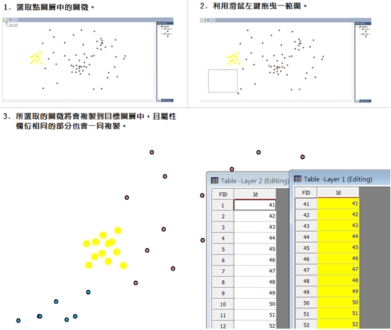 首先開啟編輯模式,並且選取一個以上來自相同圖層的圖徵,同時編輯目標圖層必須與所選取的圖層為相同的圖層類型。比方說,選取點圖層A當中的兩個點圖徵,並且將編輯目標圖層設定為另一個點圖層B,如此一來就能夠將所圖層A中所選取的圖徵複製並貼上到編輯目標圖層B當中。