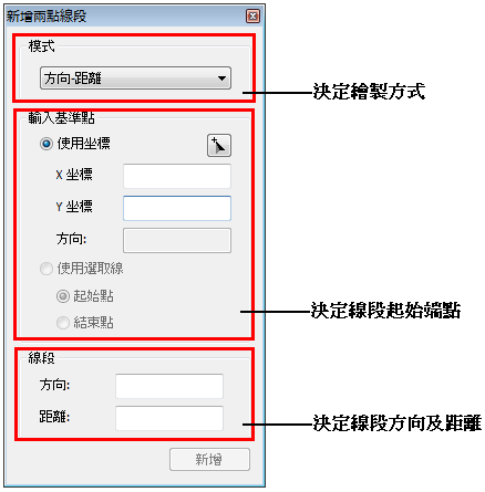 ,會出現「新增兩點線段」的視窗,讓您選擇以「方向-距離」或是「角度-距離」的方式進行兩點線段的繪製。