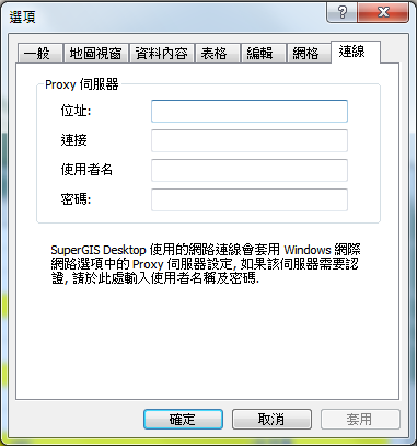 1.開啟「選項」視窗後切換到「Connection」頁籤,Address及Port因為尚未設定Proxy Serve所以目前為空白。