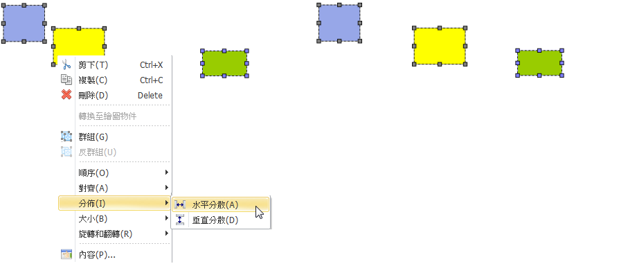 調整多個圖形物件分佈位置的方法,可運用「水平分散」和「垂直分散」工具,將每個圖形物件之間的左右距離或上下距離平均。「水平分散」和「垂直分散」工具,僅適用於三個或三個以上的圖形物件。因此,將所有物件選取後,按滑鼠右鍵,點選「分佈」,選擇「水平分散」或「垂直分散」,「水平分散」會以圖形中心於最左邊的圖形為基準,調整其他圖形物件位置;「垂直分散」則以圖形中心於最上方的圖形為基準。或是您也可以選取物件後,點選圖形工具列上的「水平分散」和「垂直分散」工具