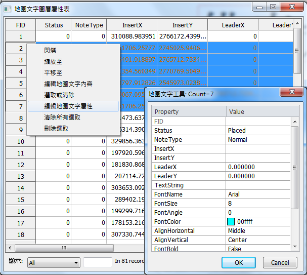 前述章節分別介紹了新增地圖文字以及一般的編輯操作。除了前述章節所提的方式外,您也可以一次選取一或多個地圖文字,並透過屬性表來一併修改設定。欲透過屬性表編輯,您有兩種方式可執行,以下分別說明: