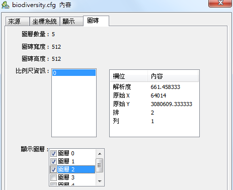 首先,您必須開啟先前產好的快取圖磚,請將STP檔案透過加入圖層的方式加入,加入後,系統預設會開啟快取圖磚內容的第一個圖層,以免快取圖磚內含有太多圖層造成讀取時間過久。若要顯示其他圖層,請在圖層列表中右鍵點擊該圖層,選取屬性來開啟屬性設定頁,並切換到圖磚頁籤。在顯示圖層選項中,您可以勾選您欲顯示的圖層,最後按下確定即可。