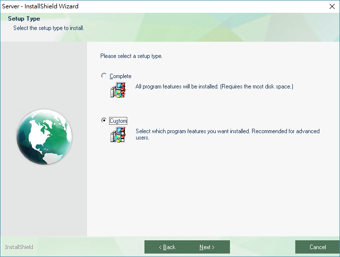 4. 「選擇安裝類型」頁面出現。選擇「Complete」完整安裝SuperGIS Sever。若您只是要安裝「SuperGIS Server」其中一個角色,請務必勾選「Custom」,並繼續點選「下一步」;