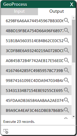 查詢結果會列於Output 頁面,使用者可以透過圖示縮放至查詢到的圖徵。