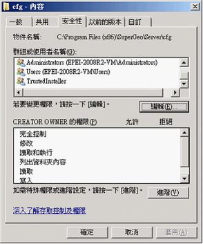 以下將按步驟示範如何為資料夾設定IIS帳戶權限,以設定「SuperGIS Server發佈服務內容」(C:\Program Files (x86)\SuperGeo\Server\cfg)為範例進行說明,其它如「SuperGIS Server服務設定內容」(C:\Program Files (x86)\SuperGeo\Server\bin\config)及「SuperGIS Server地圖快取設定」(C:\MapCache)的操作設定方式皆完全相同,您可以參考下列步驟自行設定這些子目錄的權限。