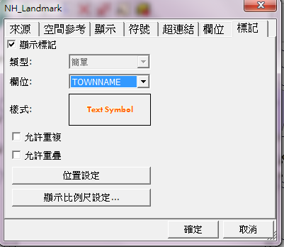 (4)「位置設定…」﹕圖層的標記分為兩種,僅線圖層所使用「線性」樣式的和所有類型的圖層皆可使用的「簡單」。會將線圖層特別獨立出來是因為線圖層上,文字有沿線和不沿線的差別,文字重覆性的問題及文字的顯示位置應在線段的那一方位,狀況較為複雜,需要另外處理。其它類型的圖層文字註解只需要考慮到文字的排版,例如:文字是要置中?靠右邊?或靠左邊?或是其他多種排列的組合,例如:設定結果優先順位為為置中,向上靠齊,這時系統就會優先做置中的排版,若遇到某些因素阻礙置中的排版,系統就會選擇第二順位的設定:向上靠齊。依此類推,當您設定幾個順位,系統就會依照這個優先順位來處理文字的位置。除此以外所有圖層都可設定標記的最大和最小可視比例,讓圖層不至於在一開始載入時,就因為過多的文字而顯得複雜零亂,這些設定可讓圖面更加美觀整齊,且方便讀取。