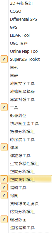 2.開啟SuperGIS後,於工具列上點擊右鍵,出現所有工具列選單,請點選「空間統計分析」,則空間統計分析擴充模組就會被啟動。
